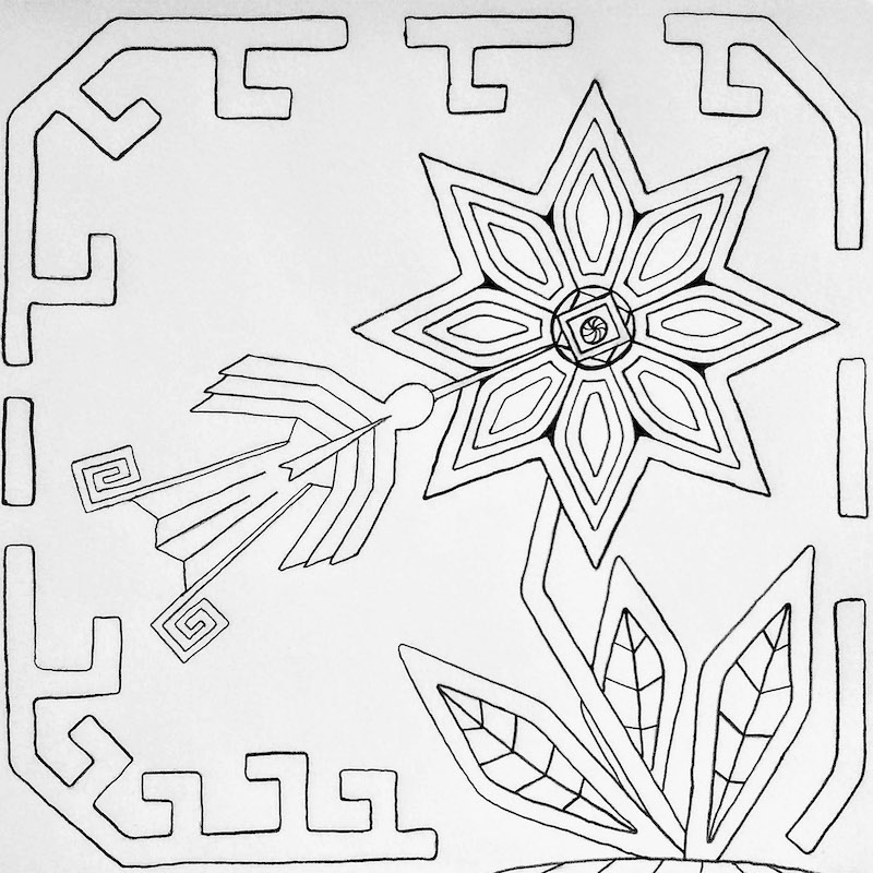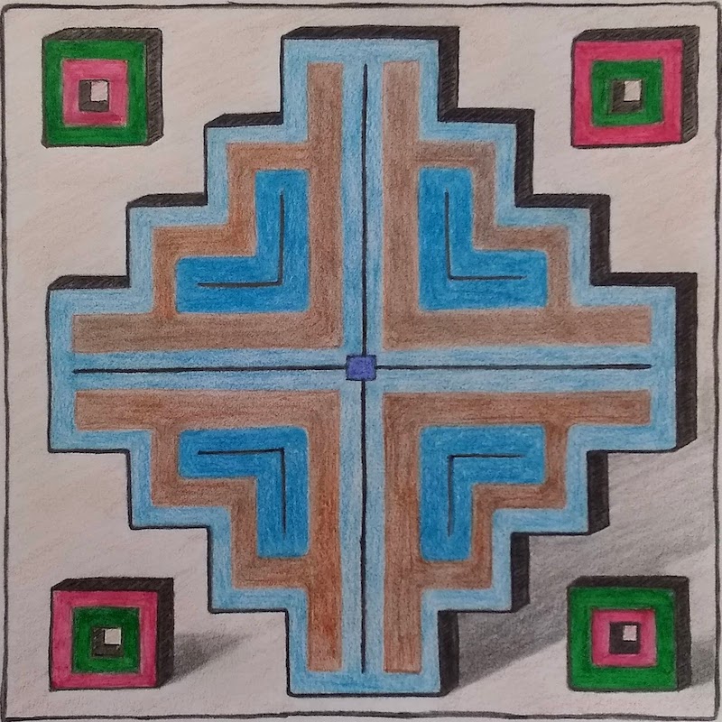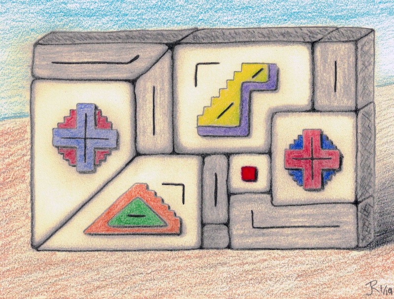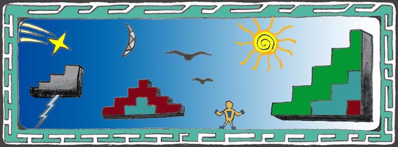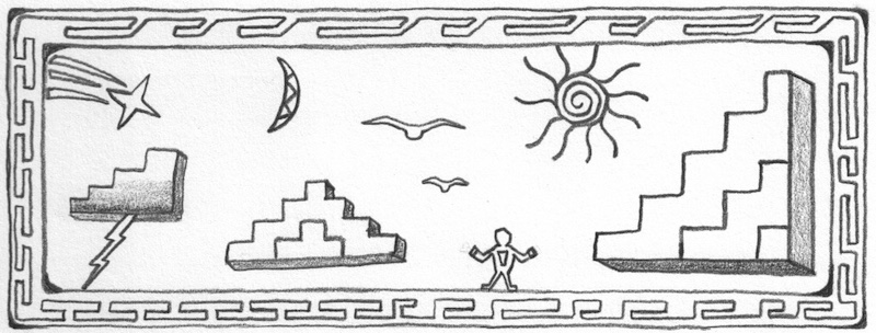 The designs and artwork in Peru opened up interesting new possibilities for drawing. I like the geometric aspects and so played around with them in this scene. The sky, storms, the stars, sun, and moon are joined by floating massive blocks. The human figure stand in awe.