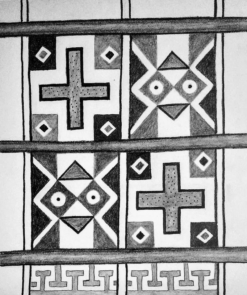 Our trip to Peru in October 2018 exposed us to new artwork and designs. The patterns in my drawing used different hardness of graphite pencils, with charcoal pencil used for the darkest places. The specific inspiration came from a very old ceramic pot (below) in the collection of the artist Pablo Seminario in the town of Urubamba in the Sacred Valley of the Inca. We visited his studio to see how his beautiful ceramics are made.